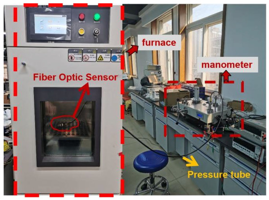 When conducting temperature experiments, keep the pressure constant and only change the temperature of the thermostat. The experimental temperature device is shown in Figure 3. The optical fiber grating demodulator used in this experiment adopts the U.S. MICRON OP ICS company SI 155; its minimum resolution is 0.02 nm, and the demodulator integrates a coupler, ASE light source (1510 nm–1590 nm), and signal demodulation system. The OMEGA thermometer has an accuracy of 0.5 °C. The length of the quartz fiber grating and the gold-plated grating in the experiment are both 3 mm, the wavelengths of the center after the structure is fixed are 1537.16 nm and 1551.48 nm, and the reflectivity is 90% and 30%, respectively.