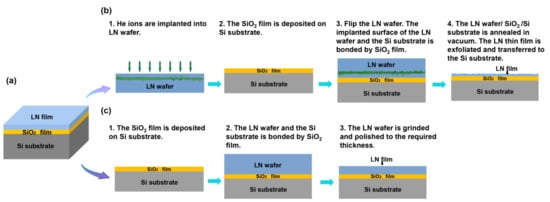 (a) Schematic diagram of the LNOI substrate structure; (b) preparation flow chart of the LNOI substrate with a nanoscale LN film; (c) preparation flow chart of the LNOI substrate with a micron-order LN film.
