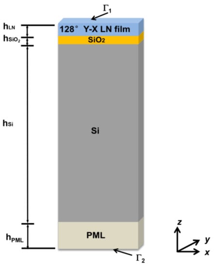 The finite element method (FEM) is a common method for accurately simulating SAW devices, which is based on the piezoelectric constitutive equation and specific boundary conditions. The FEM is suitable for analyzing SAW characteristics in piezoelectric multilayer structures because it is highly flexible. The 3D model of the LNOI substrate was established in COMSOL, as shown in Figure 3. The model presents a periodic unit of the LNOI substrate. In this model, hLN is the LN thin film thickness, and hSiO2 is the SiO2 layer thickness. The thickness of the Si substrate is replaced by a finite depth of 5 wavelengths (λ) and a perfectly matched layer (PML) at the bottom with a thickness of 1 λ [31]. The PML gradually absorbs mechanical and electrical interference by segments before they reach the boundary, resulting in a smaller model size [36]. In addition, the spurious resonance introduced by reflections at the top and bottom can be suppressed. The boundary conditions of the LNOI substrate model are as follows: (1) mechanical boundary conditions: the upper surface Γ1 is free, and the lower surface Γ2 is fixed; (2) electrical boundary conditions: the upper surface Γ1 has zero charge or is grounded, and the lower surface Γ2 has zero electric charge; (3) the front and back sides and the left and right sides have periodic boundary conditions; and (4) the LN/SiO2 interface and the SiO2/Si interface have continuous mechanical boundary conditions.
