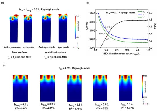 There are multiple SAW modes in the LNOI substrate, such as Rayleigh and Love waves, which can be determined by the displacement distribution of the resonant modes. Rayleigh waves propagate on the surface of the medium, and their displacement components are mainly concentrated in the x and z directions, with almost no displacement components in the y direction. Figure 4a shows the anti-resonance and resonance modes of a Rayleigh wave on the LNOI substrate with an hLN of 0.2 λ and an hSiO2 of 0.2 λ. The resonant frequencies are 68.368 MHz and 66.894 MHz under free and metalized surface conditions, respectively. Furthermore, the vf and vm values of this structure are calculated to be 3418.4 m/s and 3344.7 m/s, respectively, and K2 is 4.31%.