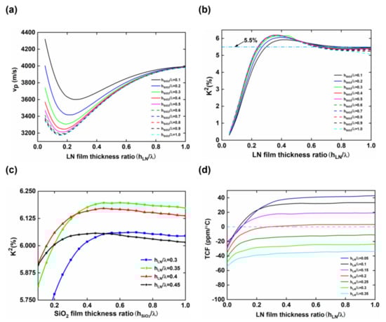 Variation in (a) vp and (b) K2 with normalized thickness of the LN thin film (hLN/λ) in the LNOI substrate; (c) variation in K2 with normalized thickness of the SiO2 layer (hSiO2/λ) in the LNOI substrate when hLN/λ is between 0.3 and 0.45; (d) variation in TCF with normalized thickness of the SiO2 layer in the LNOI substrate when hLN/λ is between 0.05 and 0.35.