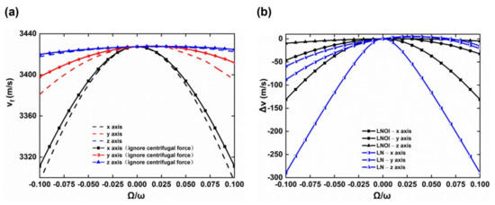 Based on the above research, the K2 of the LNOI substrate with hLN/λ = 0.35 and hSiO2/λ = 0.6 is as high as 6.2%, and the Rayleigh wave velocity is 3427.35 m/s. This LNOI substrate was selected to further study the gyroscopic effect after loading a rotation. Figure 6a illustrates the velocity curves of this LNOI substrate after rotation about the x-, y- and z-axes. The ordinate represents the Rayleigh wave velocity after loading a rotation; the horizontal coordinate represents the normalized rotation angular rate Ω/ω, where + and − correspond to clockwise or counterclockwise rotations of the LNOI substrate about an axis; and the dotted and solid lines indicate whether the influence of the centrifugal force is considered. As seen from the figure, the velocity changes of Rayleigh waves propagating along the x-axis of the LNOI substrate differ after rotation about the x-, y- and z-axes. When rotating about the x-axis, the SAW velocities after clockwise and counterclockwise rotations are the same, so the velocity change after loading a rotation cannot be detected by the differential scheme. When rotating about the y- and z-axes, the SAW velocities after clockwise and counterclockwise rotations are different, so the velocity change can be detected by the differential scheme. However, compared with rotation about the y-axis, the wave velocity changes after rotation about the z-axis are very small, rendering them more difficult to detect. From wave equation (2), the centrifugal force has a linear relationship with the square of Ω/ω. Figure 6a demonstrates that the influence of the centrifugal force becomes more obvious with increasing Ω/ω. The centrifugal force has a more noticeable effect on the Rayleigh wave velocity propagating along the x-axis when rotating about the y-axis. However, since the frequency of SAW devices is generally above MHz and the angular velocity measured daily is not very large, the influence of the centrifugal force was ignored in the early development of SAW gyroscopes. From Figure 6a, the effect of the centrifugal force on the SAW velocity is very small when ∣Ω/ω∣0.025 and can almost be ignored.