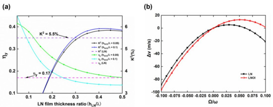 (a) Rayleigh wave phase velocity of the LNOI substrate (hLN/λ = 0.35, hSiO2/λ = 0.6) with rotation; (b) comparison of the phase velocity shift (Δv) depending on Ω/ω between the LNOI substrate (hLN/λ = 0.35, hSiO2/λ = 0.6) and LN crystal.