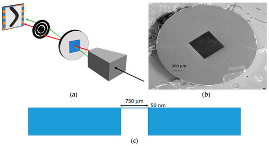 Several nanostructures have been made using electron beam lithography (EBL) on membrane substrates. EBL is a method that uses a tightly focused beam of electrons scanned over the surface of the substrate. The samples include Si3N4 transparent membranes for MTXM measurements, with a window area of 750 μm × 750 μm and a very small thickness of 50 nm, where the nanostructures must be patterned (Figure 1). In the measurements, the focused X-rays—which have a fixed energy—impact on the sample, before passing through the membrane and creating the image in the detector after being diffracted by a Fresnel zone plate.