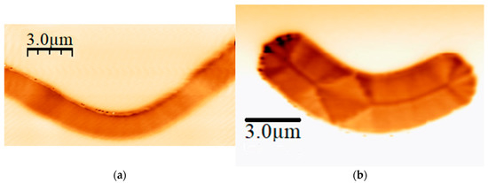 As was indicated in Section 2, we have performed Magnetic Force Microscopy measurements in samples grown on Si substrates, which have different Py thicknesses. In view of the MFM images, a wide “boomerang” is needed in order to see special features in the magnetization. As it can be seen in Figure 4, in an 80 nm Py “boomerang”, the magnetization just “goes” from one end of the strip to the other, while different types of domain walls can be seen in a 140 nm Py “boomerang”. That is the reason to increase the Py thickness. Unfortunately, due to the characteristic shape of the membranes and their inherent fragility, breaks are not unusual. In fact, Py layers of up to 100–120 nm were made with relative ease, but the common method seemed not to be the proper way to deal with samples with thicker Py layers, since all of them broke. In fact, the aim is to have a good aspect ratio in the thickness axis and, therefore, a larger resist thickness in the lithography process is needed.