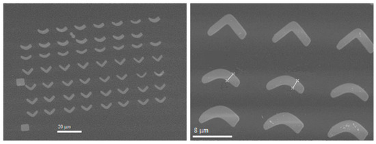 The purpose of this research is to look for the appropriate curvature and the suitable electronic dose to obtain the desired magnetic walls. To perform this efficiently, several arrays of nanostructures are disposed in every membrane, so we have in each sample different curvatures and different electronic doses, the highest dose being around one hundred times higher than the lowest one. This layout gives a great variety of structures. The nanostructures have a curved shape similar to a boomerang, as sketched in Figure 2. The “boomerang” widths range from 0.1 μm to 2.5 μm in the lithographed samples, whereas they have an approximate length of 8–12 μm, depending on the curvature and on the Py thickness. An example is shown in Figure 3, where SEM images of some 100 nm thick Py nanostructures can be seen.