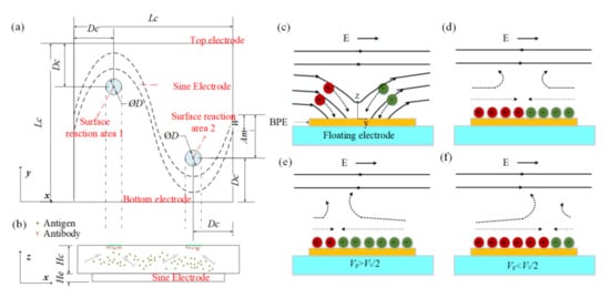 Above all, the electric field distribution can be adjusted by energizing the sinusoidal bipolar electrode with different voltages, further enabling efficient and flexible enhancement of heterogeneous immunoassays in a specific reaction area and contributing to the reasonable selection of the location of binding surface. This proposed device using coplanar the sinusoidal BPE electrodes has several advantages, such as low cost, being easy to fabricate, better controllability, and high efficiency, since other methods usually require laser [39], micromotor [28], or complicated 3D structure [7,40].