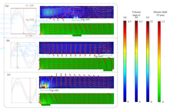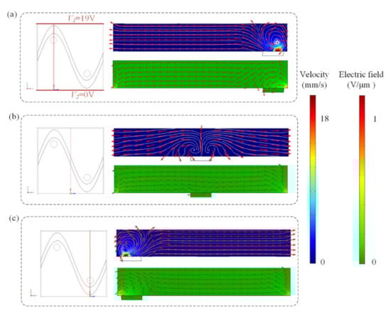The asymmetrical distribution of the flow field and electric field at different cross-sections ((a) x = 250 μm, (b) x = 125 μm, and (c) x = 375 μm) after applying an AC signal with a voltage of 19 V and a frequency of 80 Hz to the sinusoidal electrode.