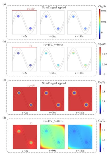 (a,b) Normalized distribution of surface concentration field of bound antigen–antibody complexes and (c,d) bulk concentration field of antigen over time for the following cases. When no electric field is applied, (a) surface antigen–antibody complexes distribution and (c) bulk antigen distribution over time indicate that the suspended antigen concentration is depleted merely by diffusion in the absence of ICEO micro-stirring. After the driving electrodes are energized with an AC signal of V1 = 19 V and f = 80 Hz, the ICEO vortexes redistributed (b) the surface antigen–antibody complexes distribution and (d) bulk antigen distribution.