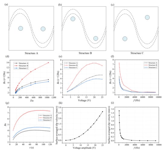 For each parameter set, the binding enhancement factor Be is calculated at t = 120 s (Figure 4d,f). According to the parameters of SARS-CoV-2 antigen and antibody, here we choose D = 3 × 10−12 m2 s−1 as the diffusion coefficient for the following simulation analysis (Da = 260.04). We also further studied the binding performance when Da is larger than 500 by changing the diffusion coefficients as shown in Figure 4d. It is noted that the effect of ICEO flow for enhancing immunoassays using these three structures is becoming more significant. As shown in Figure 4d, the antigen–antibody binding efficiency increases with increasing Da number, especially for Structure B. According to this plot, we can predict how much binding enhancement can be generated by ICEO flow vortexes at a sinusoidal electrode. The ICEO flow micro-stirring in Structure B yields an enhancement factor of 10 higher binding for Da = 500. The results show that for all values of Da, a reasonably significant enhancement factor can be obtained in Structure B compared to other structures including Structure A and C.