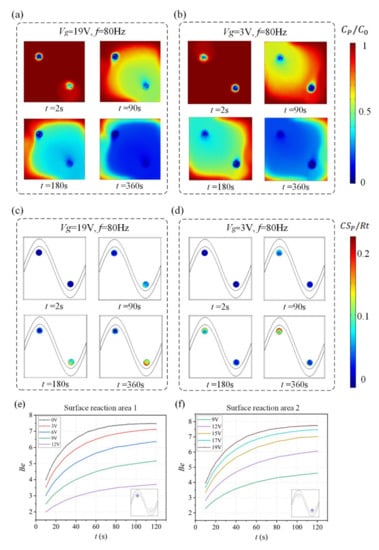 Simulation results in Figure 6a,c show suspended antigen concentration field and the surface concentration field of bound antigen–antibody complexes in the micro-cavity over time after applying an AC signal of Vg = 19 V (Vg > V1/2) to the sinusoidal electrode at V1 = 19 V, V2 = 0 V and f = 80 Hz. A large electric field forms and produces a strong asymmetric ICEO flow (Figure 5a) near the region where the sinusoidal electrode is located closest to the ground electrode at V1 = 19 V, V2 = 0 V, Vg = 19 V, and f = 80 Hz, facilitating a strong, continuous, and non-invasive mixing of the target molecule with the immobilized antibody in the reaction area 2. In this case, compared to the reaction area 1, strong ICEO vortexes generated at the bipolar electrode surface near the reaction area 2 redistribute the depleted antigen concentration, and the majority of the surface binding of antigen occurs near the reaction region 2. On the other hand, when the sinusoidal bipolar electrode is driven with an AC signal of Vg = 19 V (Vg < V1/2) at V1 = 19 V, V2 = 0 V, and f = 80 Hz, a strong asymmetric ICEO flow will appear near the region where the sinusoidal electrode is located furthest the ground electrode. As a result, antigen concentration distribution and the surface concentration distribution of bound antigen–antibody complexes within the cavity are shown in Figure 5b,d. The near-wall deleted concentration is replenished with fresh antigen in surface reaction area 1 due to strong ICEO flow micro-stirring, thus generating a uniform and rapid distribution of antigen concentration near surface reaction area 1. We finally explore the binding enhancement factor Be versus times at each surface reaction area by flexibly changing the voltages applied to the sinusoidal electrode, as depicted in Figure 6e,f. When Vg < V1/2, the binding enhancement can be improved in surface reaction area 1 with the decreasing voltage applied to the sinusoidal electrode. When the sinusoidal bipolar electrode is driven with an AC signal of Vg = 0 V (Vg < V1/2) at V1 = 19 V, V2 = 0 V, and f = 80 Hz, the binding enhancement factor Be in surface reaction area 1 can reach about 7.5 at 120 s. In contrast to reaction area 1, the depletion effect near surface reaction region 2 can be alleviated due to the strong ICEO micro-stirring as the sinusoidal electrode is driven by a gate voltage Vg (Vg > V1/2) and the binding performance is enhanced greatly with the increasing voltage exerted upon the sinusoidal electrode.