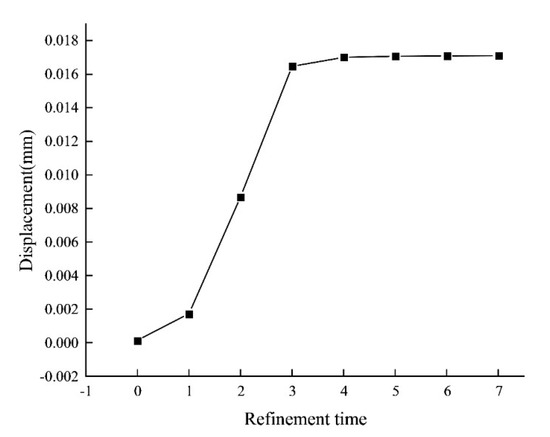 In order to obtain reasonable subdivision times, the convergence analysis of output displacement is carried out by increasing the refinement times. Figure 5 shows the displacements of worktable center point with different refinement times. The data begin to remain stable over the five times of refinement. Therefore, the curved beam elements with five times of refinement are selected.
