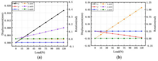 The displacements and rotations in Figure 6 demonstrated that the compliant mechanism has six degrees of freedom. As shown in Figure 6a, when a force is applied on the X-axis, an accompanying rotation around the Y-axis will be generated. Similarly, when the Y-axis force is applied, an accompanying rotation around the X-axis will be generated, as shown in Figure 6b. These are a disadvantage of this structure. Although it can achieve six degrees of freedom, it has a certain coupling between different directions.