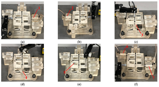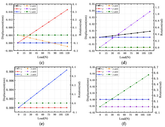 Figure 11. The loading and measuring on six degrees of freedom. (a) Loading along X-axis direction. (b) Loading along Y-axis direction. (c) Loading along Z-axis direction. (d) Loading around X-axis direction. (e) Loading around Y-axis direction. (f) Loading around Z-axis direction.