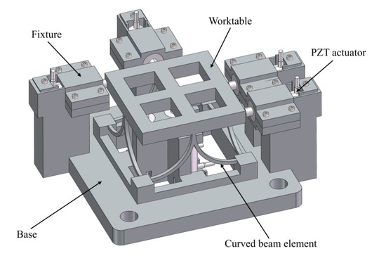 In order to reduce the error caused by assembly, the compliant mechanism can be manufactured by 3D printing. Then the compliant elements, the worktable, the base, and the fixtures of the actuator are integrated, as shown in Figure 7.