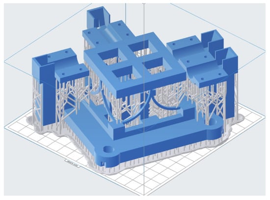 The compliant mechanism is manufactured using a Form 3 printer with low-stress light-curing molding technology, and a transparent photosensitive resin material is chosen. The total height of the printed model is 62.75 mm, the layer thickness is 0.1 mm and the accuracy of the 3D printer is 0.025 mm. The model for 3D printing with supports is shown in Figure 8.