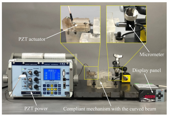 The compliant mechanism is driven by piezoelectric ceramic actuators PSt150/7/20 with fast response and nanometer resolution. The driven voltage ranges from 0 V to 150 V, and the displacements are measured by a micrometer. Static driving force should be applied, so the static force loading mode on the control software of the piezoelectric ceramic actuators is selected. The curved beam compliant mechanism and actuators are assembled into an experimental device as shown in Figure 9.