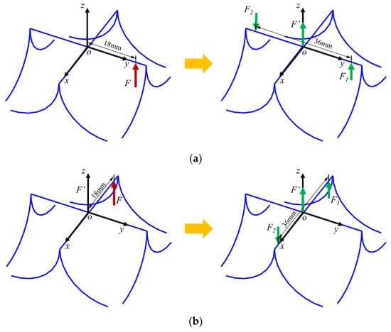 Figure 10. Equivalent relationship between force and moment under X-axis and Y-axis loading. (a) Equivalent relationship between force and moment under X-axis loading. (b) Equivalent relationship between force and moment under Y-axis loading.