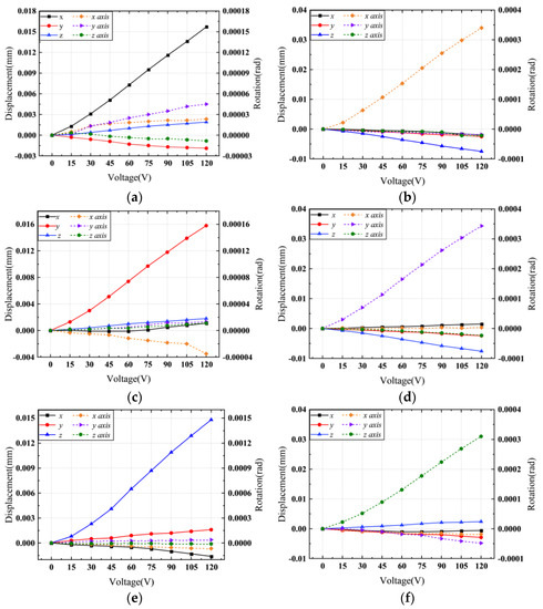 Voltages from 15–120 V are applied to the actuators, then the displacements and rotations of each direction are recorded by the micrometer. The relationship between the input voltages and the output displacements and rotations is shown in Figure 12.