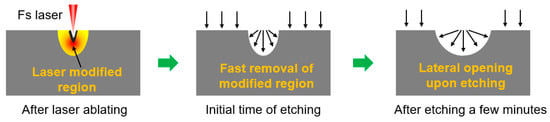 - Liu, X.-Q.; Bai, B.-F.; Chen, Q.-D.; Sun, H.-B. Etching-Assisted femtosecond laser modification of hard materials. Opto-Electron. Adv. 2019, 2, 19002101–19002114. [Google Scholar] [CrossRef]