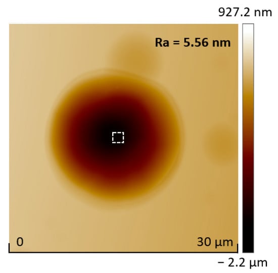 First, undoped silicon wafers were cleaned with acetone, ethanol, and deionized water for 30 min to obtain a clean surface. The femtosecond laser (343 nm, 200 kHz, 280 fs (Light Conversion Pharos, Vilnius, Lithuania)) is tightly focused through a high numerical aperture objective lens (NA = 0.95, 40×) and matched with a three-dimensional piezoelectric platform (the strokes of the x- and y-axes are 1.5 mm, that of the z-axis is 100 μm, and accuracy is 1 nm) to realize the preparation of micro/nanostructures on the silicon surface [,,,,,]. In addition, the femtosecond laser can also be used to process other materials via multi-photon absorption, for example, lift off GaN [,]. After femtosecond laser treatment, a laser-modified region was formed on the silicon surface, changing its physical and chemical properties. Here, the femtosecond laser was used to change the etching rate in a local region with a generation of amorphous and polycrystalline phases, and composition change [,]. Then, the silicon sample was etched via ICP (ICP-100A, Tailong Electronics, Beijing, China) with SF6 gas at the flow rate of 80 sccm, with the upper electrode power of 500 W, and a lower electrode power of 100 W. In the initial time of the dry etching process, the etching rate of the laser-modified area was greater than that of the unmodified area, and the modified area first etched round holes. With the further progress of etching, owing to the influence of isotropic etching, we can expand outward through the circular hole to obtain a silicon-based microlens with a smooth surface (Figure 1). The surface roughness can be decreased to about 5.56 nm (Figure 2), obtained by measuring the bottom of the microlens.