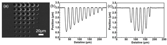 The dry etching rate of the modified region formed by the femtosecond laser is related to the degree of modification [,,]. By adjusting parameters, such as the power of the femtosecond laser and the number of femtosecond laser pulses, regions with different degrees of modification can be realized. Based on this, we fabricated the microlens arrays with different diameters and depths on silicon wafers. According to the scanning electron microscopy (SEM) result (Figure 3a) and the cross-sectional view of the microlens array (Figure 3b,c), this method can realize the controllable preparation of microlenses with different structural parameters. The actual size of the lens changes periodically according to the experimental expectation, and the lens surface is smooth.