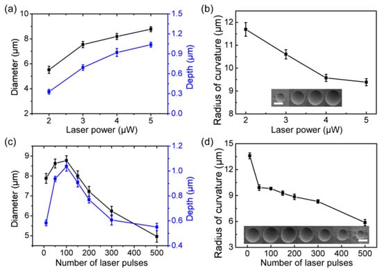 - With an increase in the laser pulse number, the diameter and depth of the silicon-based concave microlens first increased and then decreased (Figure 4c). This is because the silicon surface would react with oxygen in the air with a greater number of laser pulses, generating a passivation layer on the silicon surface and preventing the etching progress. Therefore, the size of the silicon-based concave microlens decreased with an increase in the number of laser pulses. The different diameters and depths of the silicon-based concave microlens can be obtained by controlling the pulse numbers of the laser. The radius of curvature gradually decreased as the number of pulses increased, as shown in Figure 4d.