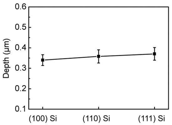 For silicon with different crystal orientations, anisotropy is often observed due to different crystal orientations in the process of wet etching. This leads to an irregular shape when etching a circular structure. To verify the effect of crystal orientation on the etching effect, we replaced silicon wafers with different crystal orientations for the experiments (Figure 6). It was found that the depths of the silicon-based concave microlenses prepared using silicon with three crystal orientations are basically the same, i.e., the morphology of the microlens is not significantly dependent on the silicon crystal orientation. This is because the principle of dry etching involves using the plasma of chemical gas to produce a chemical reaction, and accelerate physical etching and chemical etching through an electric field, so the etching is isotropic. It should be mentioned that by changing the etching gas in the cycle during the etching process, high-aspect-ratio silicon microstructures can be realized [,]. Therefore, different patterned silicon-based microlens arrays can be prepared using this method.
