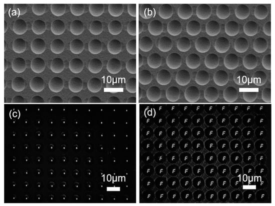 Femtosecond laser processing has a high degree of freedom, which can plan the trajectory of light spots and then realize the preparation of arbitrary patterned structures. In the experiment, two types of silicon-based microlens arrays were prepared by controlling the movement of a three-dimensional platform. First, the silicon wafer was ablated by a femtosecond laser to form a rectangular arrangement and a honeycomb dense arrangement lattice. Then, the silicon wafer processed using the femtosecond laser was etched via ICP. Owing to the use of the same laser parameters, the modification degree of each part was the same, thus two groups of microlens arrays with the same size and good morphology were formed after dry etching. The two silicon-based microlens arrays were characterized via SEM; the SEM images are shown in Figure 7a,b. Finally, the optical properties of the rectangular array microlens were characterized, as shown in Figure 7c,d. Thus, the silicon-based lens array has good focusing and imaging effects.