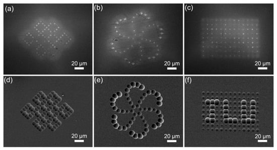 In addition to the above regular microlens array, an arbitrary arrangement of microlenses with inconsistent structures and sizes can be realized by adjusting the laser parameters and scanning path in the experiment. Through this method, some other specific microlenses were fabricated, such as Chinese knots, petals, and hidden letters, as displayed in Figure 8a–c. The corresponding SEM images obtained after etching each pattern are shown in Figure 8d–f. It is difficult to distinguish the final designed microlens array from the laser-modified pattern. After etching, microlenses of different sizes were formed to realize a clear pattern. In particular, the letters “JLU” were difficult to observe after laser modification. Following etching, the hidden letters can be clearly seen by the distinction of the microlens diameter.