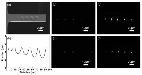 where r and h are the radius and depth of the microlens, respectively; R is the radius of curvature of the microlens, and f is the focal length of the microlens. According to Equations (1) and (2), the focal lengths of the leftmost and rightmost microlenses were 7 and 9 μm, respectively. Figure 9b presents the cross-sectional characterization curve of the multifocal microlens array. Because of the different focal lengths of the microlenses, the focus morphology and imaging effect also differ at different positions. The focusing and imaging of the lens arrays at different focus positions are depicted in Figure 9c–f. When the large lens is at the focus, the focus and imaging of the rear small lens are unclear. Contrarily, when the small lens is in focus, the large lens will be out of focus. A multifocal microlens array was successfully fabricated on a silicon microcantilever, enabling the integration of micro-optical devices and MEMSs.