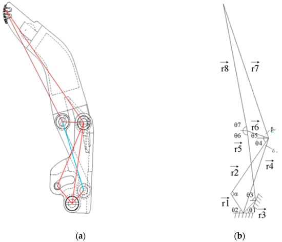 In order to make the hand movement simpler and more effective, each finger is designed with one less joint, namely one degree of freedom. The finger trajectory analysis model is composed of three links, which can be calculated by vector equation, as shown in Figure 2a. The vector diagram of the finger kinematics is presented in Figure 2b.