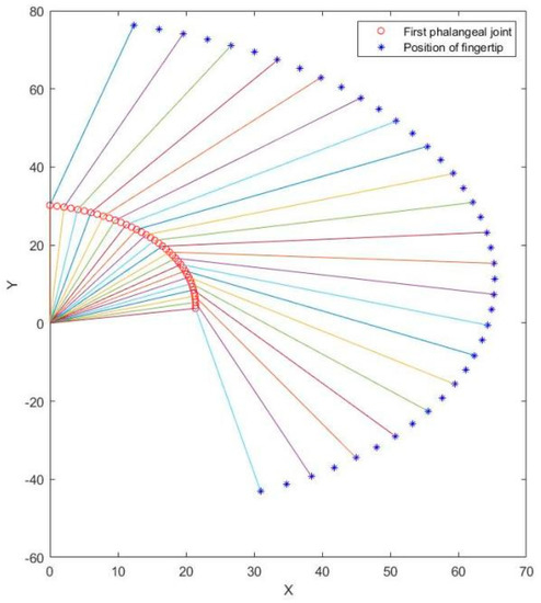 Then the system can be solved with these equations by using MATLAB for finger position analysis. Figure 3 shows the finger movement trajectories of BIT Hand C in different postures and manipulable space. As can be seen from the figure, the maximum movement angle of the first knuckle can reach 84.5 degrees, and the maximum movement angle of the second knuckle is 135 degrees. It can be seen that BIT Hand C can fit the maneuverability space of the normal hand well. While the finger of the Attobock hand is only composed of a solid structure, and the grasping finger has only one degree of freedom, when the hand grasps an object, the contact surface between the finger and the object mostly has only one fulcrum. Furthermore, BIT Hand adopts an underactuated connecting rod mechanism design, which not only ensures the driving motor pulling force but also enables fingers to realize underactuated grasping ability, so as to ensure at least two surfaces contact between fingers and objects, which can better ensure the stability of grasping action.