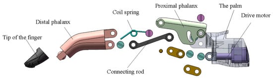 The four fingers of BIT Hand C are driven by the connecting rod mechanism, which is designed to suit the driving principle. Take the right index finger, for example, we describe the finger structure in detail, as shown in Figure 4.