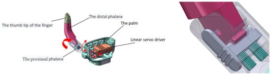 The thumb part, the maximum angle of rotation of which is 75 degrees consists of the proximal knuckle, distal knuckle, and fingertip, as shown in Figure 5. A linear servo drive placed in the palm of the hand enables it to rotate. However, the opening and closing movement of the thumb is passive, which requires individuals with upper-limb differences to adjust the motion position through their own healthy hands. A linear servo drive is LAS10-023D, with a maximum push force of 105 N, which is used for rotation drive.