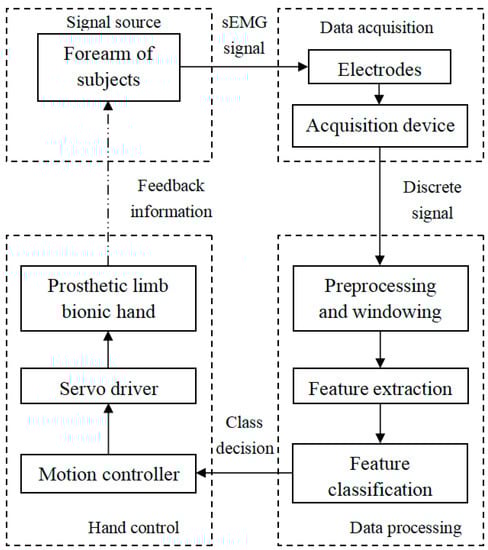 The surface electromechanical signal (sEMG) has a peak value of 0–6 mv and a frequency range of 0–500 hz is one-dimensional time-series signal recorded by electrodes on the surface of the muscle during neuromuscular system activity [12,13] have the properties of non-stationary, non-linear, complexity, and large variation. At the same time, when the handicapped wear the prosthetic bionic hand, there will also be sweating of the skin, muscle fatigue [14,15,16,17], ECG noise, device noise [18,19] and other environmental conditions. These characteristics make it so difficult to analyze surface electromechanical signals under multiple action modes well. Generally, the recognition of human movement intention through electromyographic signals is mainly divided into three steps [20]: signal preprocessing, feature extraction and feature classification [21,22,23]. The signal preprocessing process generally includes signal amplification, filtering and notch. This process is a significant step, which directly affects the reliability of signals [24]. Feature extraction is used for extracting relevant information from sEMG signal, and rejecting noise and other unimportant components. Feature extraction of sEMG signals mainly includes time domain analysis, frequency domain analysis and time-frequency domain analysis. Time domain analysis includes Integrated EMG, Mean Absolute Value (MAV), Root Mean Square (RMS), Zero Crossing, etc. [25]. Frequency domain analysis includes Autoregressive coefficient (AR), Modified Median Frequency (MMDF), etc. [26], and time-frequency domain analysis includes Wavelet Transform (WT), Wigner–Ville distribution (WVD), etc. [27].