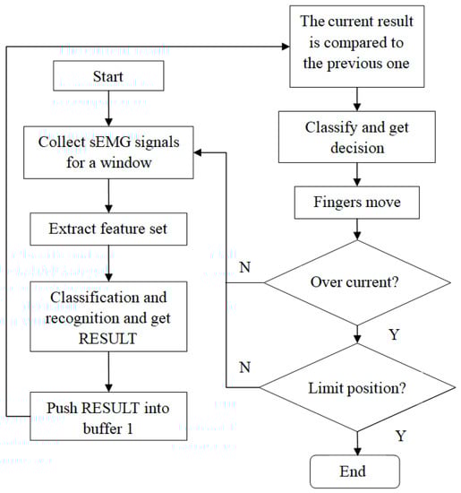 The control strategy of BIT hand C is shown in Figure 7. Firstly, the sliding window is applied to process real-time data into frames, and the window size and frameshift are 250 ms and 100 ms, respectively. After data amplification and filtering, feature extraction and action pattern recognition are carried out on the processed data, then the final classification results are imported into the control system. Next, we adopt a classification algorithm to classify the mode of it, that of grasping or opening. Once the algorithm detects the mode successfully, it can be then be judged as corresponding motion. Finally, the system will send the command to the motor of BIT hand C and then it will be driven to move, so as to realize the grasping and opening action.
