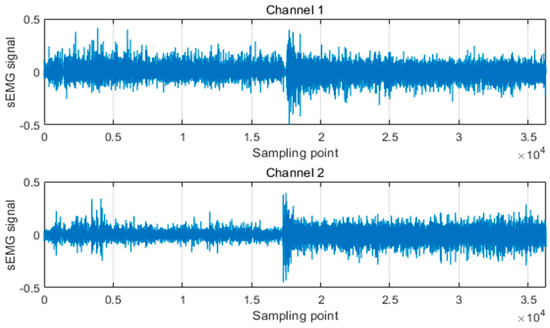 Before electrodes are placed, the skin paste should be treated, including removing hair, removing sweat, and wiping clean with alcohol. As experiment shows, we select brachioradialis muscle and extensor digitalis muscle as objects to obtain the sEMG signals, which show obvious change during different hand movements. The placement position of the electrodes is shown in Figure 8. In this paper, we set the sampling frequency of the surface electromechanical signal at 1000 Hz. The amplitude of the original EMG signal is only 0–6 Mv, so we design the amplifier circuit to amplify it, and we also perform a filter to remove the noise. Finally, the usable EMG signal can be obtained. In Figure 9, we present the raw sEMG signal from two electrodes.