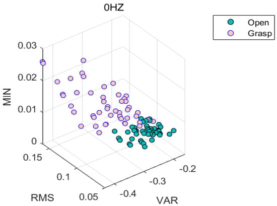 Green points represent the eigenvalue when the hand is open, while pink points represent the eigenvalue when the hand is grasped. It can be seen from Figure 11 that the three features, VAR, RMS, MIN, can be well distinguished using the LDA classification algorithm. After training, we tested the new action data and calculated its accuracy with Equation (18).