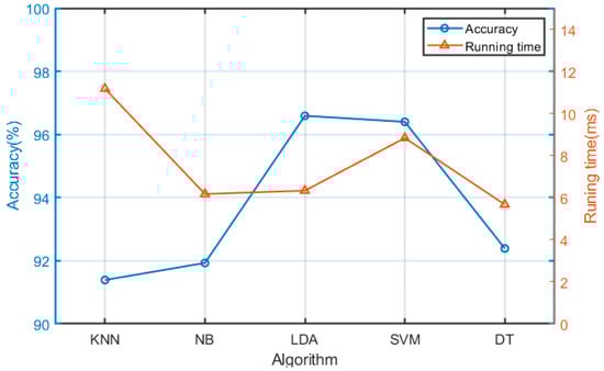 From Figure 12, we can see that LDA can achieve an accuracy of 96.59%, which is greatly higher by 4.2% and 4.66% than that of DT and NB respectively. Furthermore, for running speed, LDA only needs 6.33 ms, which is only slightly slower by 0.5 ms and 0.16 ms than that of DT and NB respectively. Weighing these factors, we conclude that LDA performs better than other algorithms.