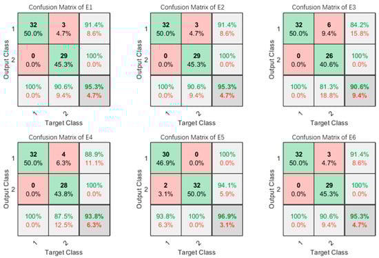 Confusion matrix of subject 1 for certain 6 times experiments (E1–E6). 1—grasping, 2—opening.
