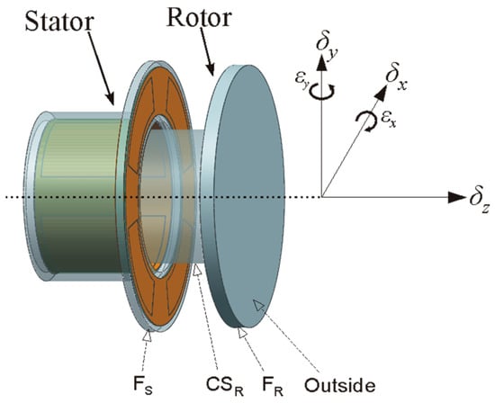 Schematic of a T-type CS. The error motions δx and δy are detected using the REG, which is in the annular groove of the stator cylindrical bore; δz and εx and εy are detected using the EPEG, which is in the annular groove of the stator end part.
