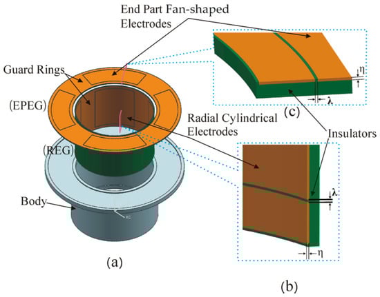 The sensing electrodes of the T-type CS include the cylindrical and fan-shaped electrodes integrated into the REG and EPEG, respectively. These electrodes are fabricated by the FPCB process in one procedure, along with the equipotential guard ring, and the sensing electrodes have a fixed position relationship with the guard ring.