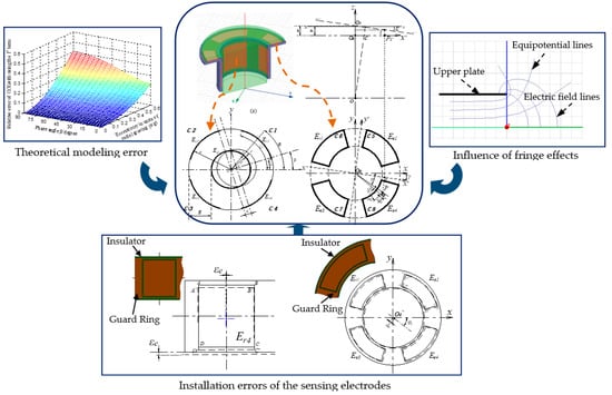 This paper focuses on the analysis of main error sources for the error motion measurement of a precision shafting using a T-type CS, as shown in Figure 3. Firstly, the theoretical modeling error due to the approximate simplification for the output capacitance expression of sensing electrodes was analyzed. Then, the influence of fringe effects was investigated using the 3D-FEA method. Finally, mathematical modeling and numerical simulation were conducted to analyze electrode installation errors, emphasizing the tilt error of the cylindrical electrode and coaxiality error of the fan-shaped electrodes.