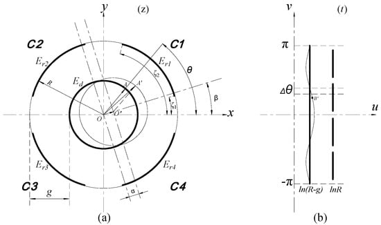 Due to the arc-shaped boundary of these electrodes, the conformal mapping method was adopted to solve the Poisson Equation in electrostatic fields []. When the rotor has radial displacement with eccentricity α at phase angle β, caused by the generated radial run-out of a spindle, the resulting variation Δu of the equivalent spacing at any point in the complex plane t can be approximately derived as []: