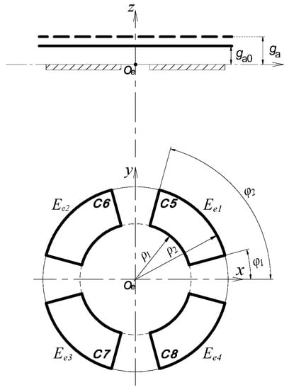 As shown in Figure 2, the fan-shaped electrodes (Ee1~Ee4) of the EPEG are also distributed in the same configuration as radial electrodes. They, along with the inside annular end face of the rotor flange (FR), make up four capacitors, respectively; the corresponding capacitance of them are denoted by C5~C8, as shown in Figure 5 [].