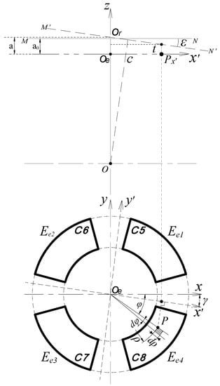 By taking the electrode Ee1 as an example, the region confined by the points C′D′S′T′ (dash line) represents the position of Ee1 under the coaxiality error δe. As shown in Figure 22b, the micro-plane element ΔBP′ (oblique line filled) at any point P′ is taken as the solving unit, and the area of this element is denoted as ΔSP′. Then, the ΔSP′ is approximately given by: