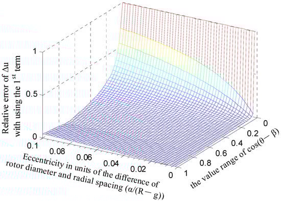 Figure 7 shows the variation situation of error Δuapp.error with the changing of parameter terms α/(R − g) and cos(θ − β). As mentioned above, the radial displacement α of a precision spindle is generally very small. In order to achieve relatively high sensitivity, the cylindrical electrode radius R is often designed to be tens of millimeters or even larger. Thus, the variation range of the term α/(R − g) is set to be [0, 0.1]. It can be observed that, when the ratio α/(R − g) is less than 0.01, the error Δuapp.error basically keeps lower than 2% with the variation in the term cos(θ − β) in the entire phase region (the value range of cos(θ − β) is [0, 1] correspondingly), except for a few phase angles. Therefore, a highly accurate value of the changing Δu calculated by Equation (1) can be obtained if the ratio α/(R − g) is less than 0.01, which can be achieved by adjusting the structural parameters of the sensor.