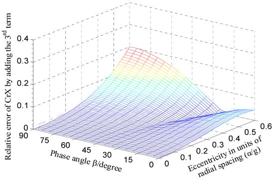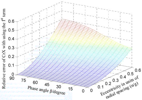 As shown in Figure 8, at each phase angle β, the approximate error CrXapp.error all increases with the increase in the ratio α/g. When the ratio α/g becomes larger than 0.2, the variation tendency is more significant. Figure 9 shows the error of the calculated capacitance CrXtl relative to the simulation value CrXf as the rotor has a displacement along the direction of y = x. The dependence of the relative error on the parameter α is basically consistent with the variation tendency shown in Figure 8. Note that the value CrXf was obtained based on the simulation model of the T-type CS previously established with the design parameters in []; these parameters were also adopted to calculate the theoretical capacitance.