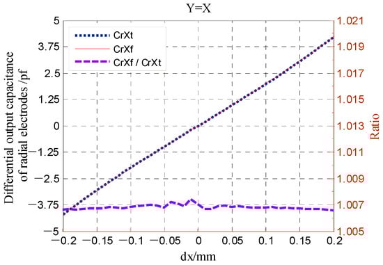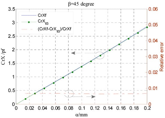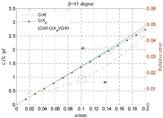 Compared to the error distribution shown in Figure 8, the error CrXapp.error is significantly decreased overall for the calculation expression of the CrX with third-order approximation, as shown in Figure 10. As the phase angle β varies from 0° to 90°, the error CrXapp.error remains less than 0.4% for the ratio α/g = 0.1 and no more than 1.2% for α/g = 0.2. Figure 11 compares the simulated differential capacitance CrXf and theoretical counterparts CrXtl3 calculated with Equation (36). The phase angle β equals 45°, that is, the rotor has a displacement along the direction of y = x. It can be observed that the deviation between the value CrXf and the CrXtl3 is closer to the actual value.